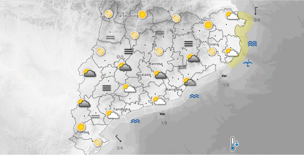 Pronòstic de l estat del cel temperatura velocitat i direcció del vent. Estat del cel temperatura màxima i mínima probabilitat de pluja vent. Informació meteorològica de catalunya previsió del temps avui radar avisos de perill temperatura notícies i novetats.